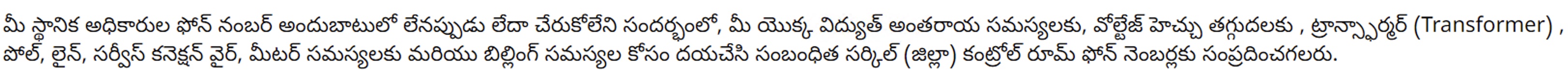 In the event of your local officers phone number is not available / reachable, for all power supply failures, voltage issues, transformer, pole, line, service connection wire, meter issues and billing issues Consumers can contact in the concerned circle (district) Office Control room phone number.