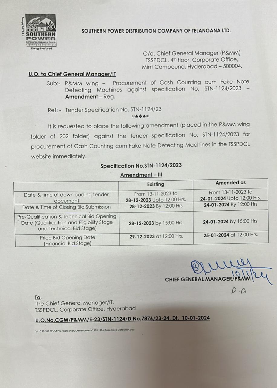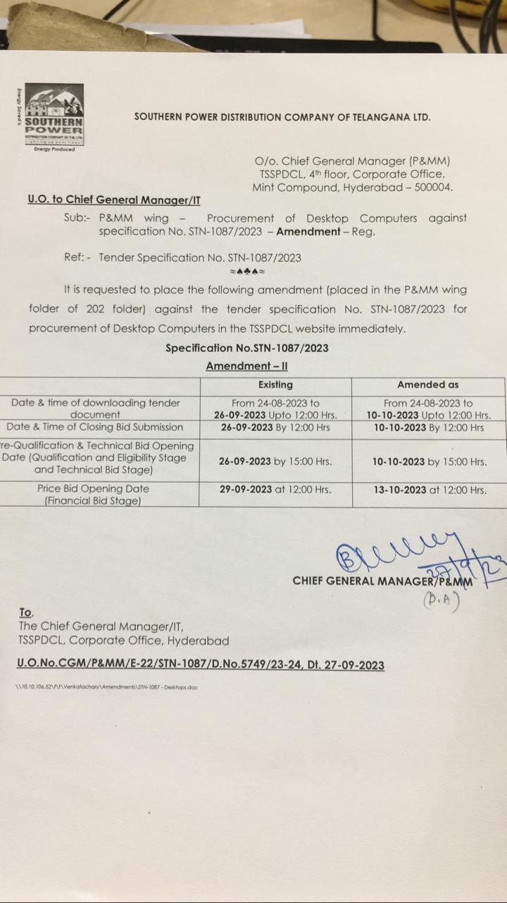Amendment ? II TENDER SPECIFICATION STN-1041/2023 CHIEF GENERAL MANAGER (P&MM) TSSPDCL